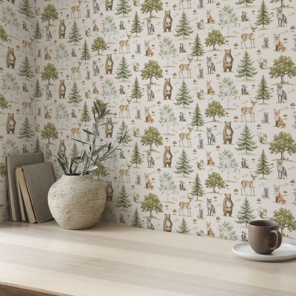 Jardín de árboles en suaves tonos verdes sobre un fondo claro.