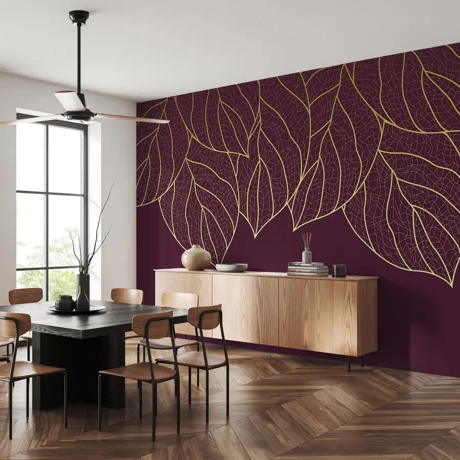Papel pintado minimalista siluetas de grandes hojas amarillas veteadas sobre fondo vino oscuro