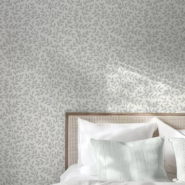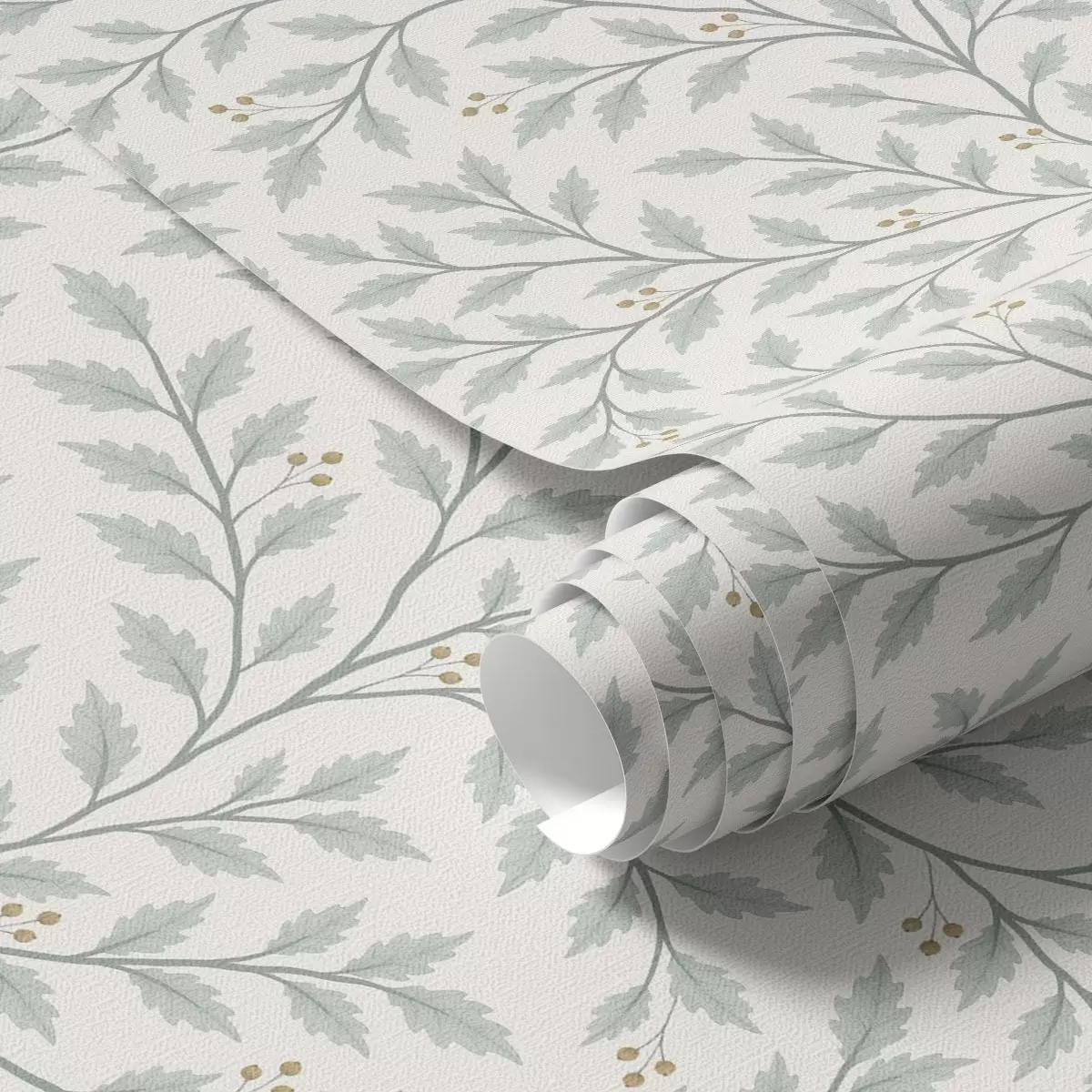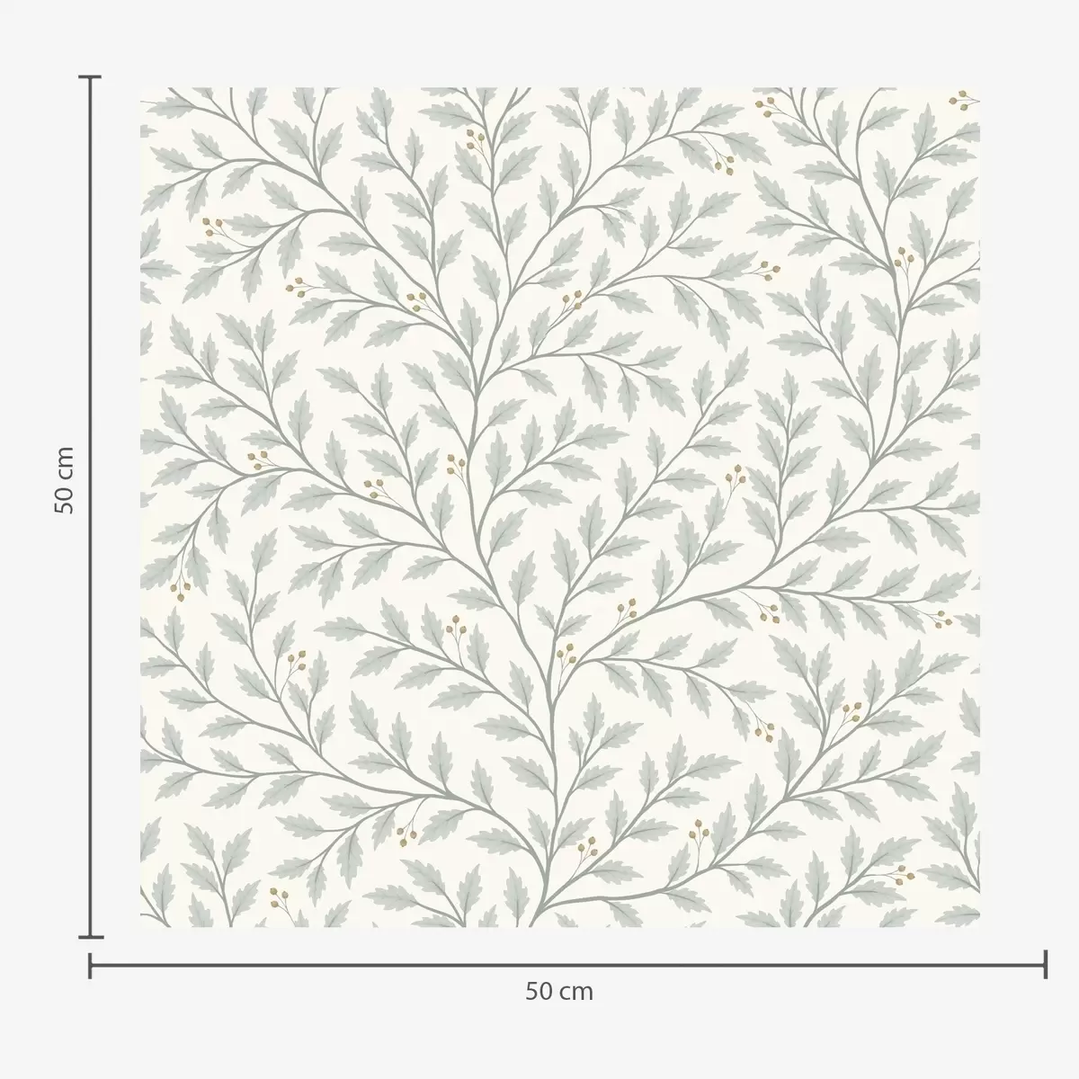 Papel pintado Ramitas con hojas y bayas, crema clara y salvia. Nr. a00783