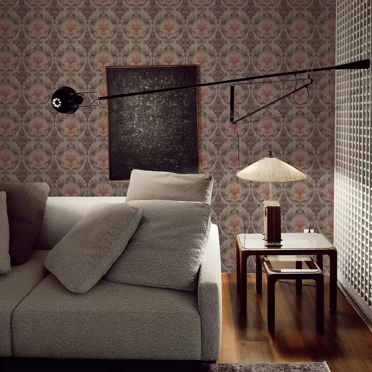 Papel pintado Damasco en tonos marrón-terracota, fondo gris cálido. a00828v2