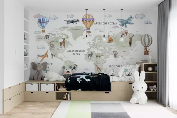 Fotomurales Mapa infantil en estilo acuarela con animales y globos aerostáticos. En alemán. Color verde. Nr. c00001de