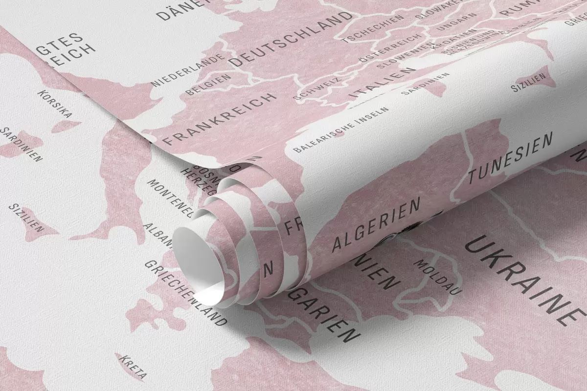 Fotomurales Mapa infantil en estilo acuarela con animales y globos aerostáticos. En alemán. Color rosa. Nr. c00001dev3