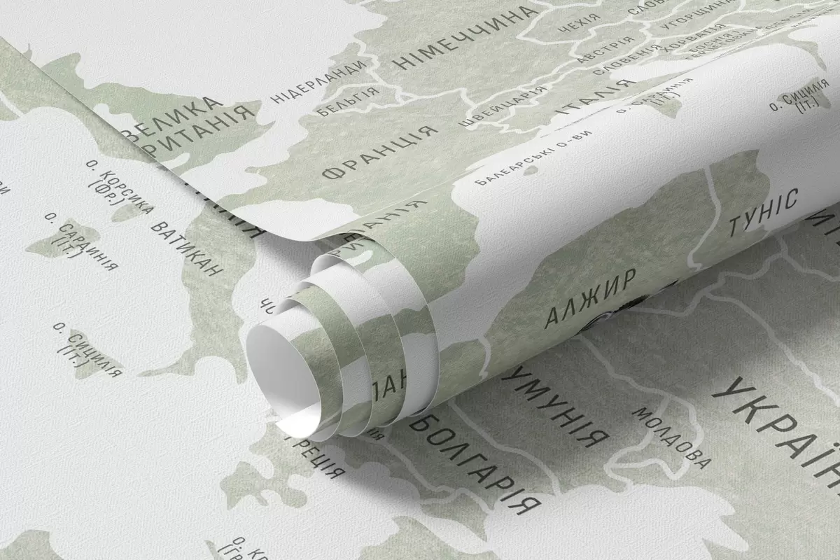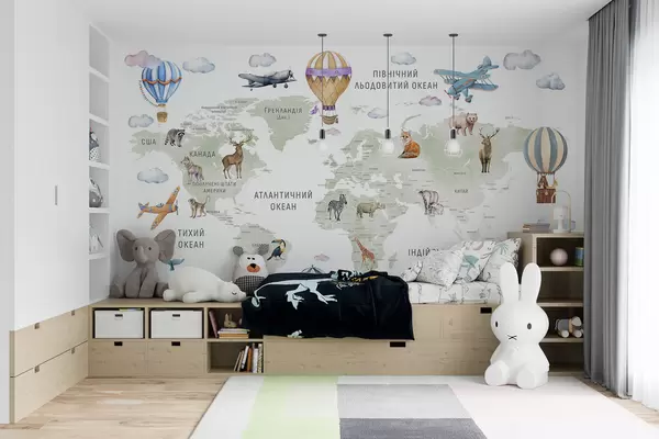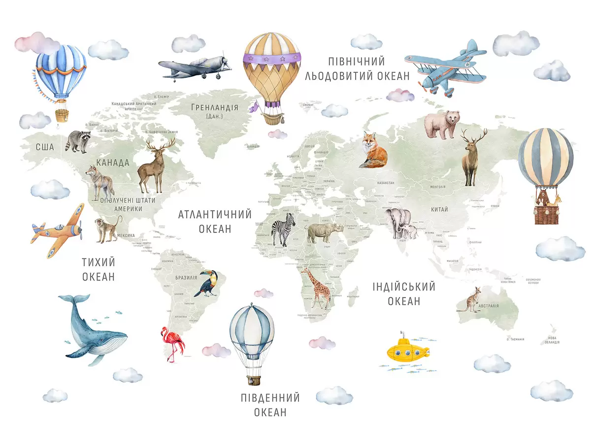 Fotomurales Mapa infantil en estilo acuarela con animales y globos aerostáticos. Idioma ucraniano. Color verde. Nr. c00001uk