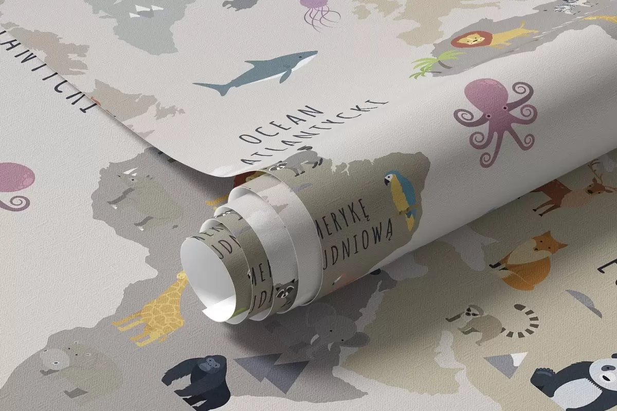 Fotomurales Mapa mundial infantil con animales y globos aerostáticos. Idioma polaco. Nr. c00002pl