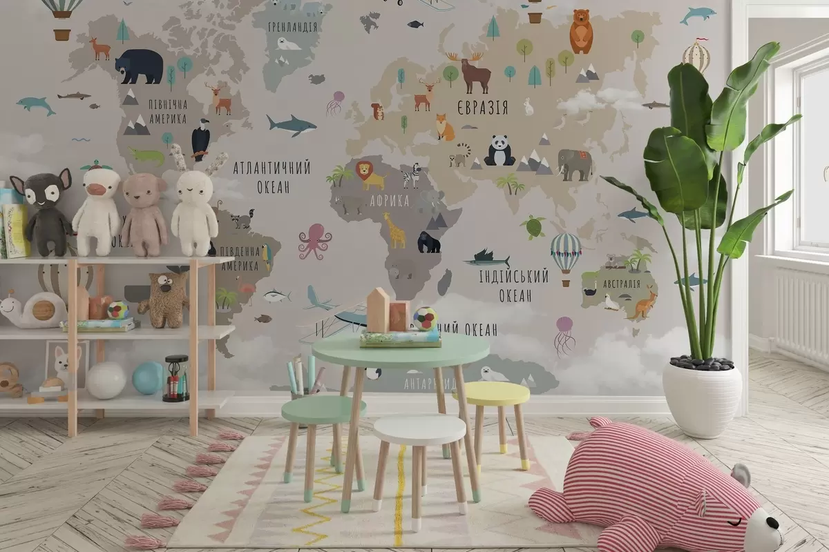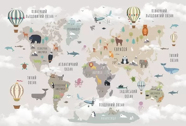 Fotomurales Mapa mundial infantil con animales y globos aerostáticos. Idioma ucraniano. Nr. c00002uk