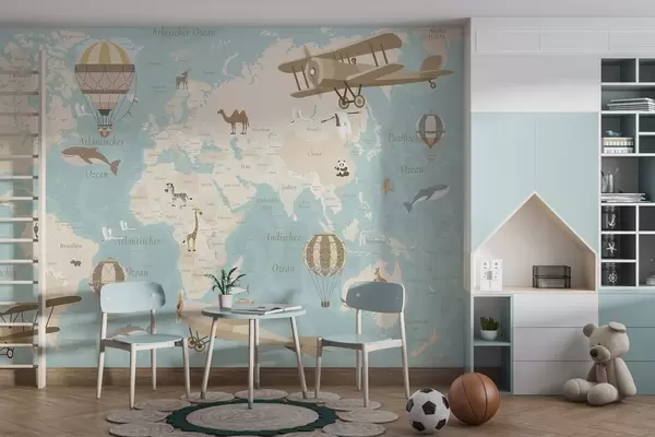 Fotomurales Mapa mundial infantil con animales, aviones y globos aerostáticos. En alemán. Color azul. Nr. c00003dev1