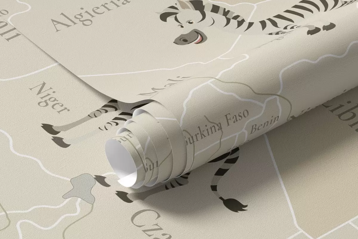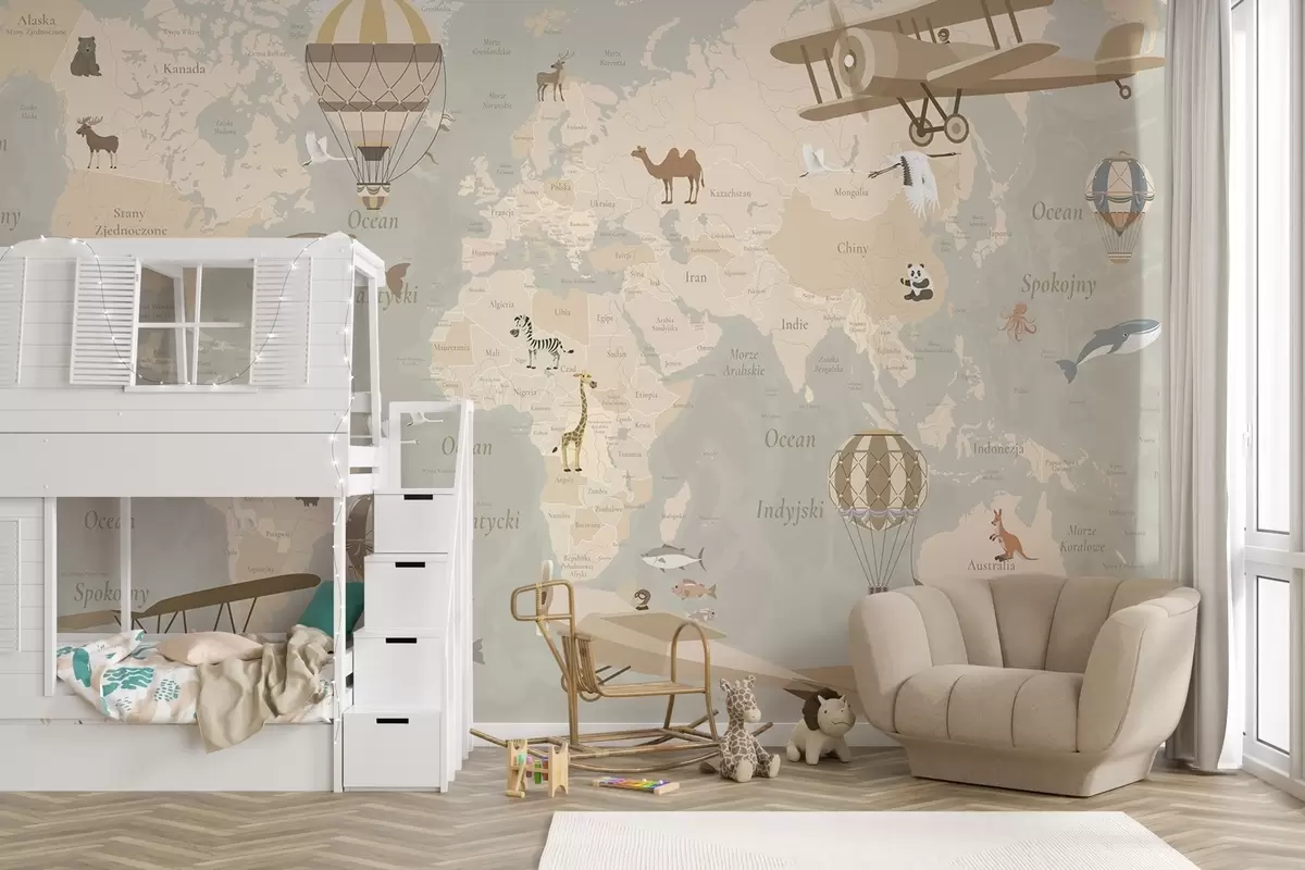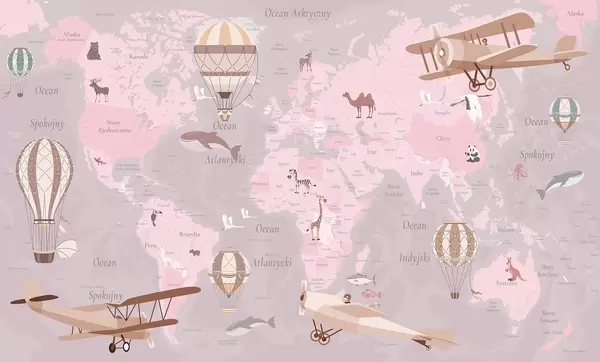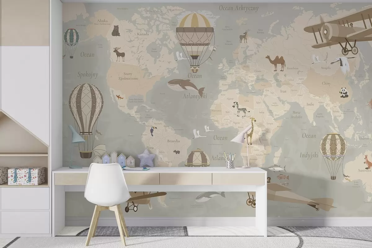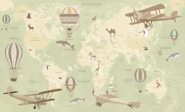 Fotomurales Mapa mundial infantil con animales, aviones y globos aerostáticos. Idioma polaco. Color beige. Nr. c00003pl