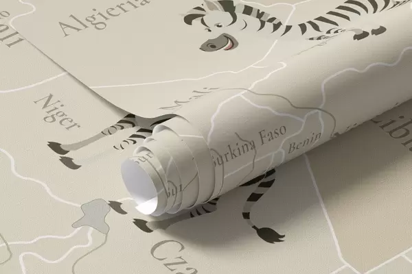Fotomurales Mapa mundial infantil con animales, aviones y globos aerostáticos. Idioma polaco. Color beige Nr. c00003pl