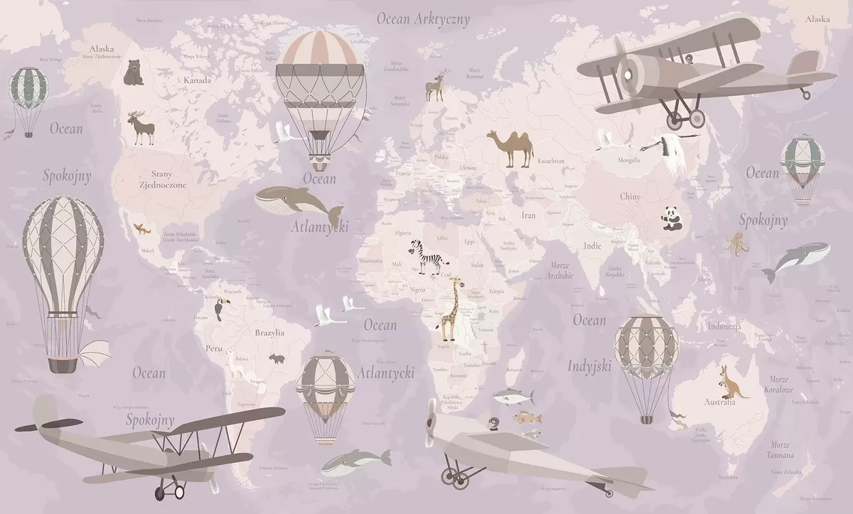 Fotomurales Mapa mundial infantil con animales, aviones y globos aerostáticos. Idioma polaco. Color morado. Nr. c00003plv4