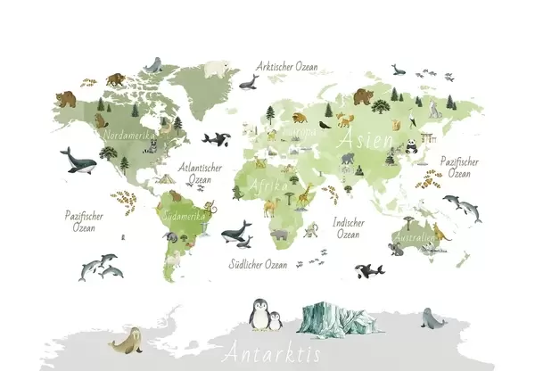 Fotomurales Un mapa de Green en estilo acuarela con animales, plantas y arquitectura. Etiquetas en alemán Nr. c00009dev2