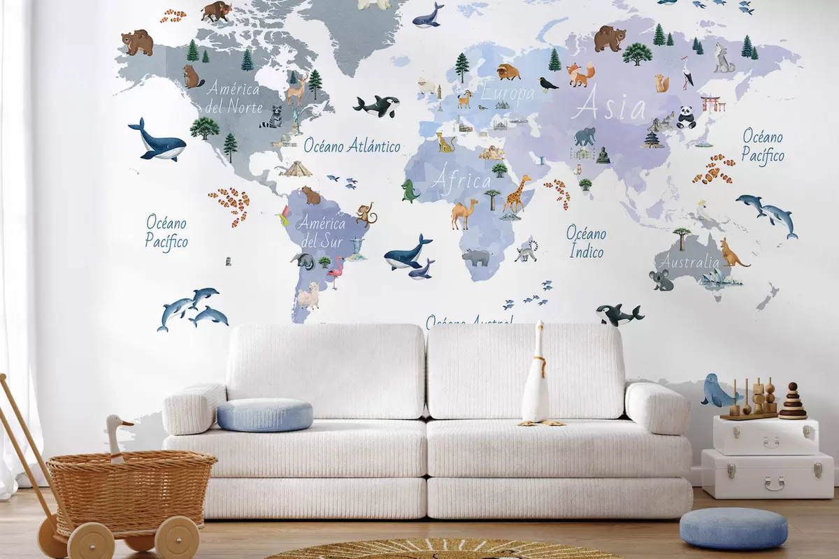 Fotomurales Un mapa azul de estilo acuarela en el que aparecen animales, plantas y elementos arquitectónicos. Etiquetas en español Nr. c00009esv1