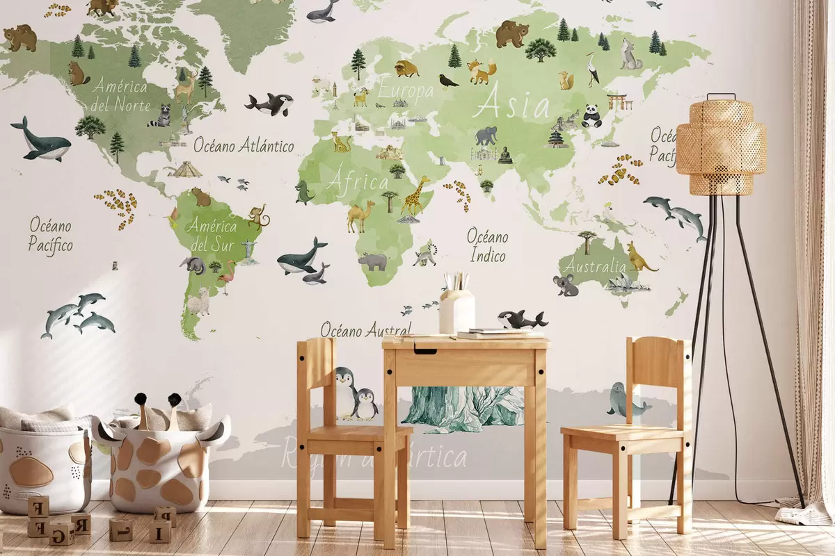 Fotomurales Un mapa de Green en estilo acuarela con animales, plantas y arquitectura. Etiquetas en español Nr. c00009esv2