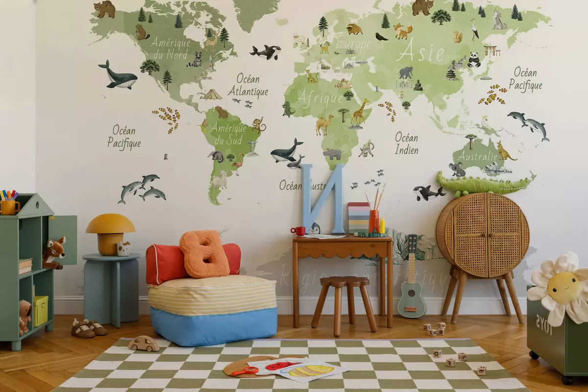 Fotomurales Un mapa de Green en estilo acuarela con animales, plantas y arquitectura. Etiquetas en francés Nr. c00009frv2