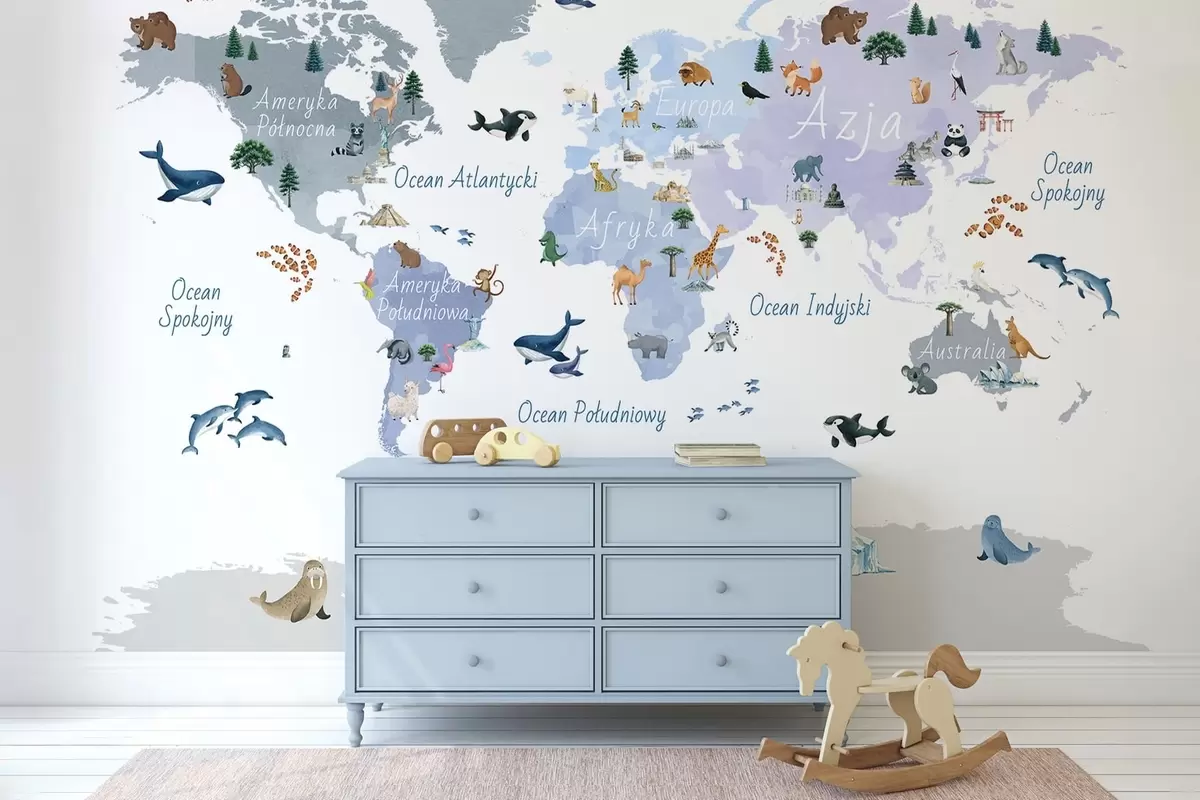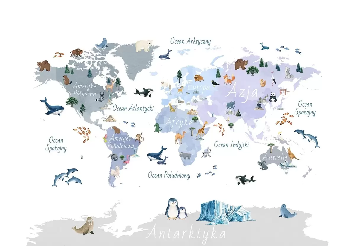Fotomurales Un mapa azul de estilo acuarela en el que aparecen animales, plantas y elementos arquitectónicos. Rótulos en polaco Nr. c00009plv1