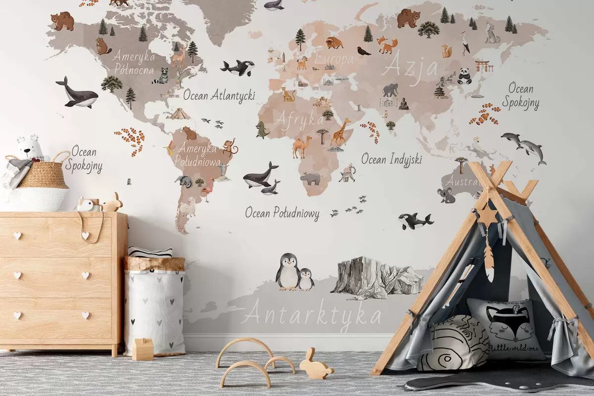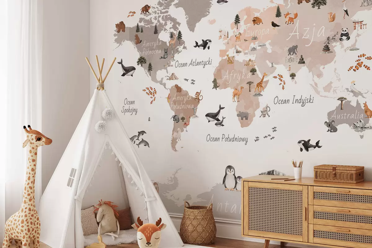 Fotomurales Un mapa en tonos beige, con un estilo de acuarela, en el que aparecen animales, plantas y elementos arquitectónicos. Rótulos en polaco. Nr. c00009plv3