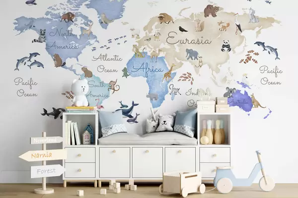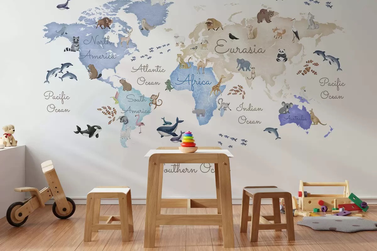 Fotomurales Un mapa azul con estilo de acuarela en el que aparecen animales. Etiquetas en inglés Nr. c00012env1