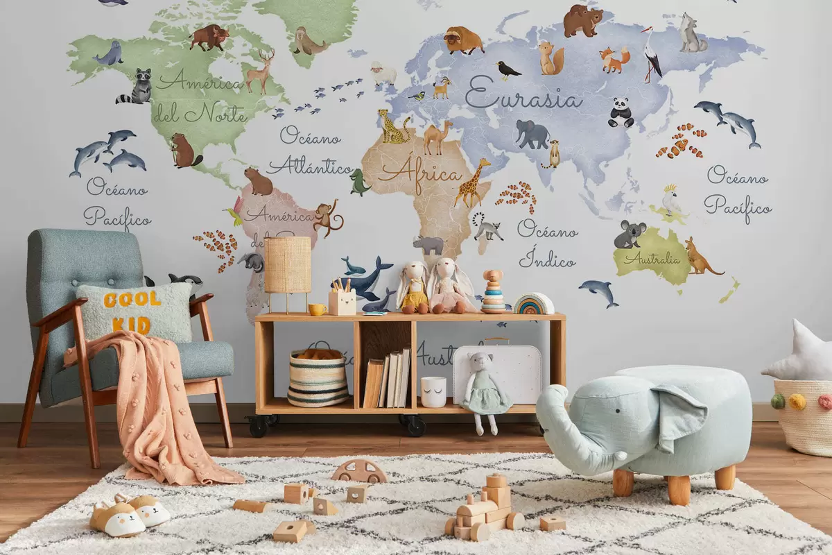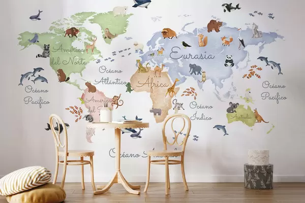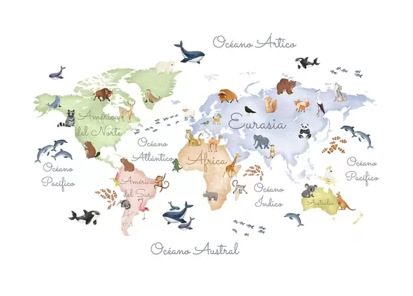Fotomurales Un mapa a color con animales, en estilo acuarela. Etiquetas en español Nr. c00012es