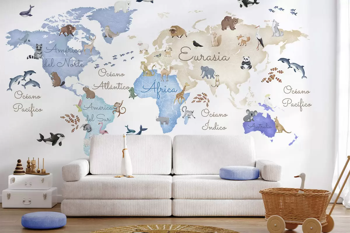 Fotomurales Un mapa azul con estilo de acuarela en el que aparecen animales. Etiquetas en español Nr. c00012esv1