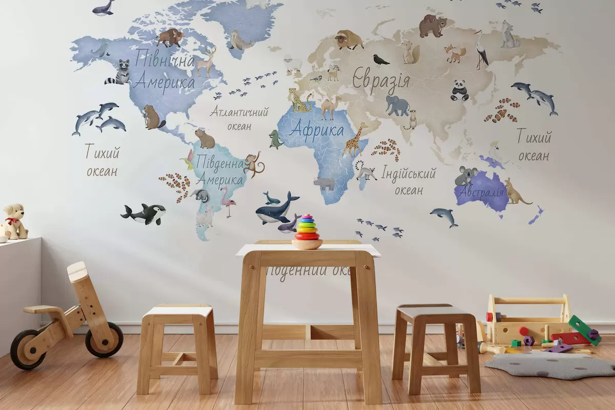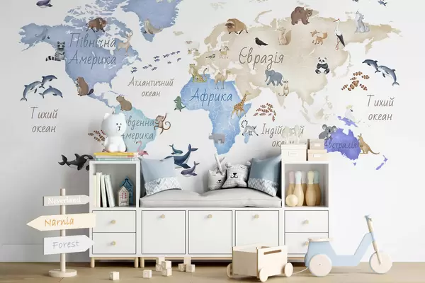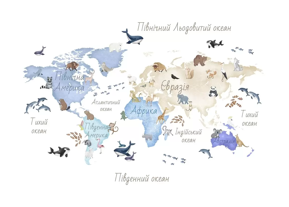 Fotomurales Un mapa azul con estilo de acuarela en el que aparecen animales. Etiquetas en ucraniano Nr. c00012ukv1