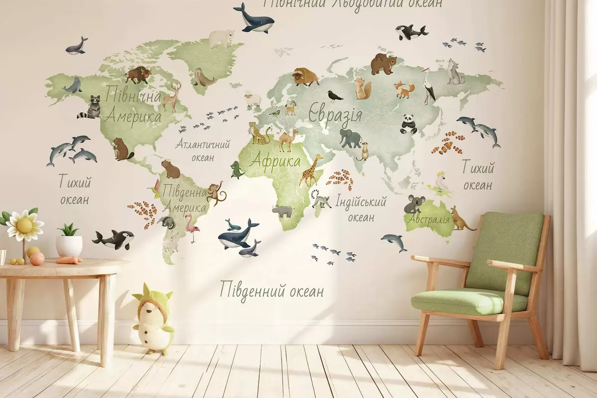 Fotomurales Un mapa verde con estilo de acuarela en el que aparecen animales. Etiquetas en ucraniano Nr. c00012ukv2