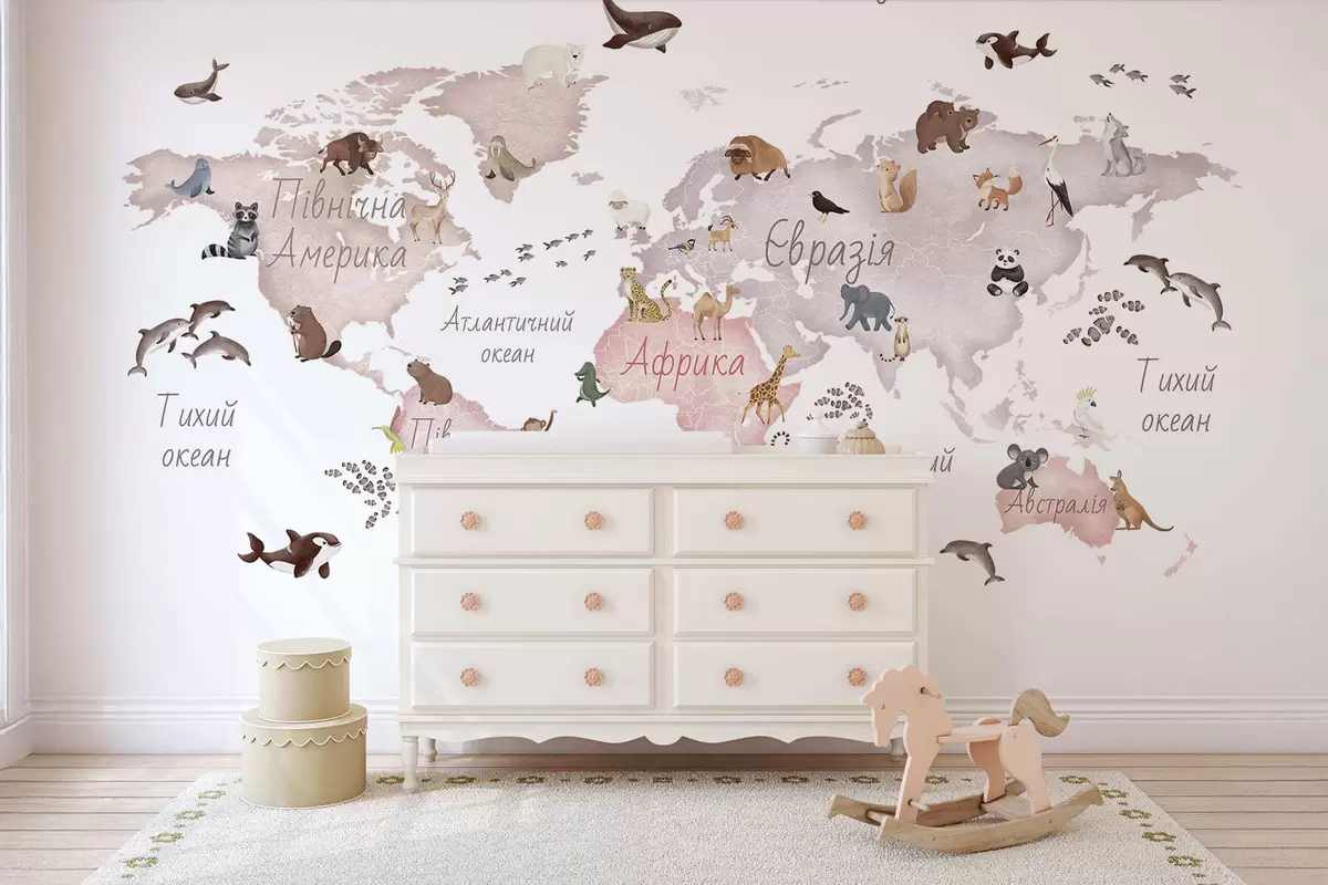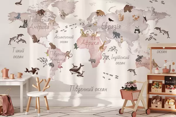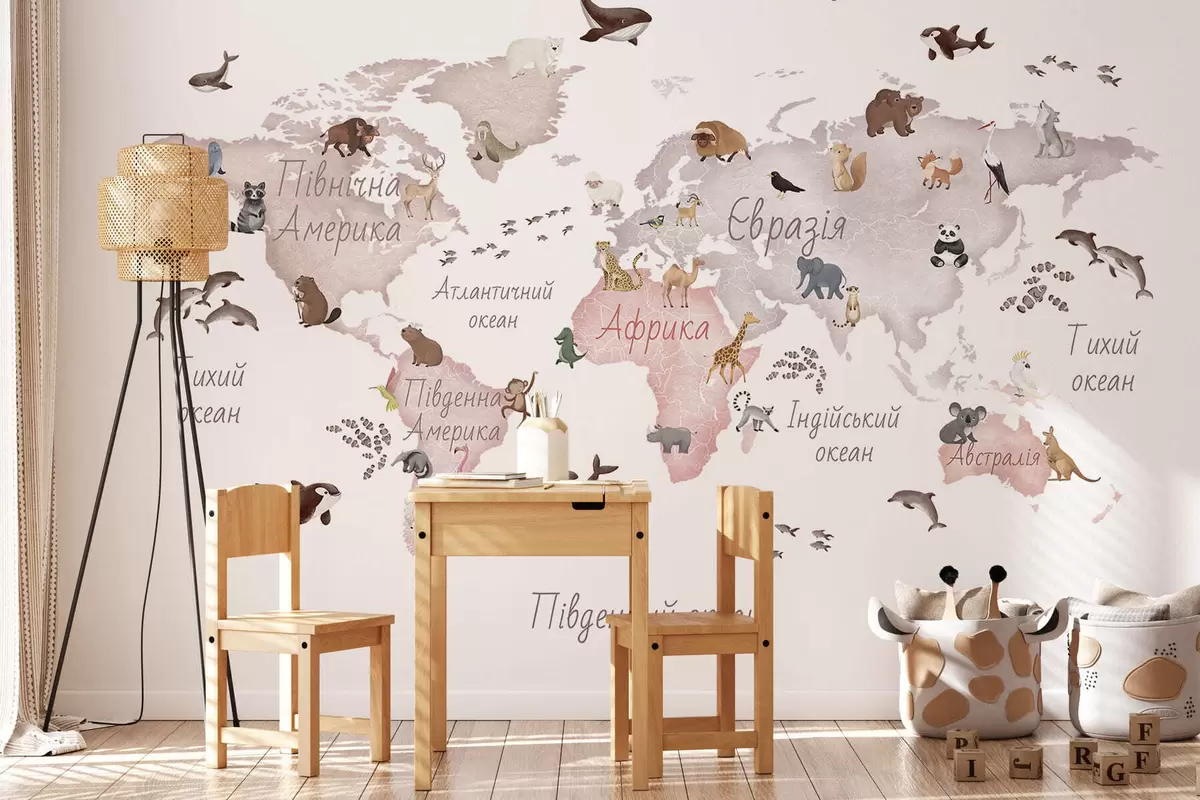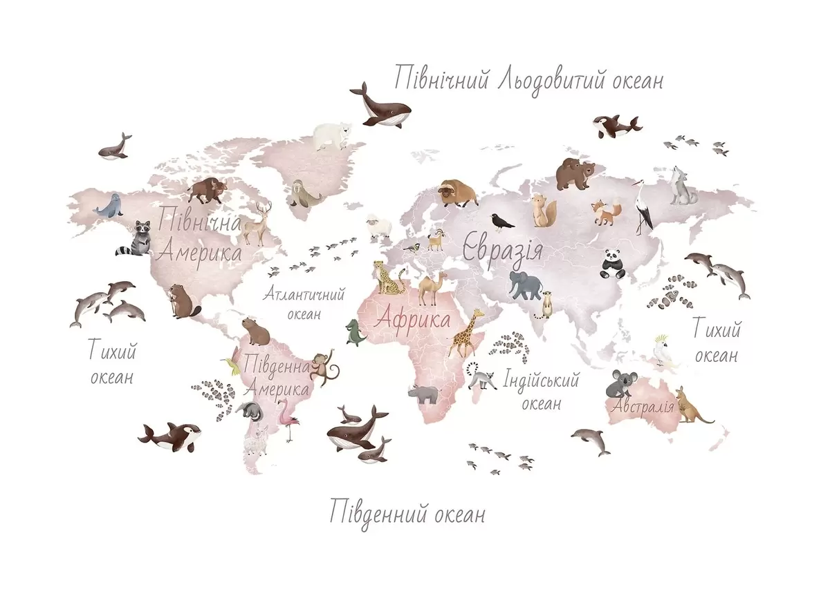 Fotomurales Un mapa en tonos beige, con un estilo de acuarela, en el que aparecen animales. Rótulos en ucraniano Nr. c00012ukv3