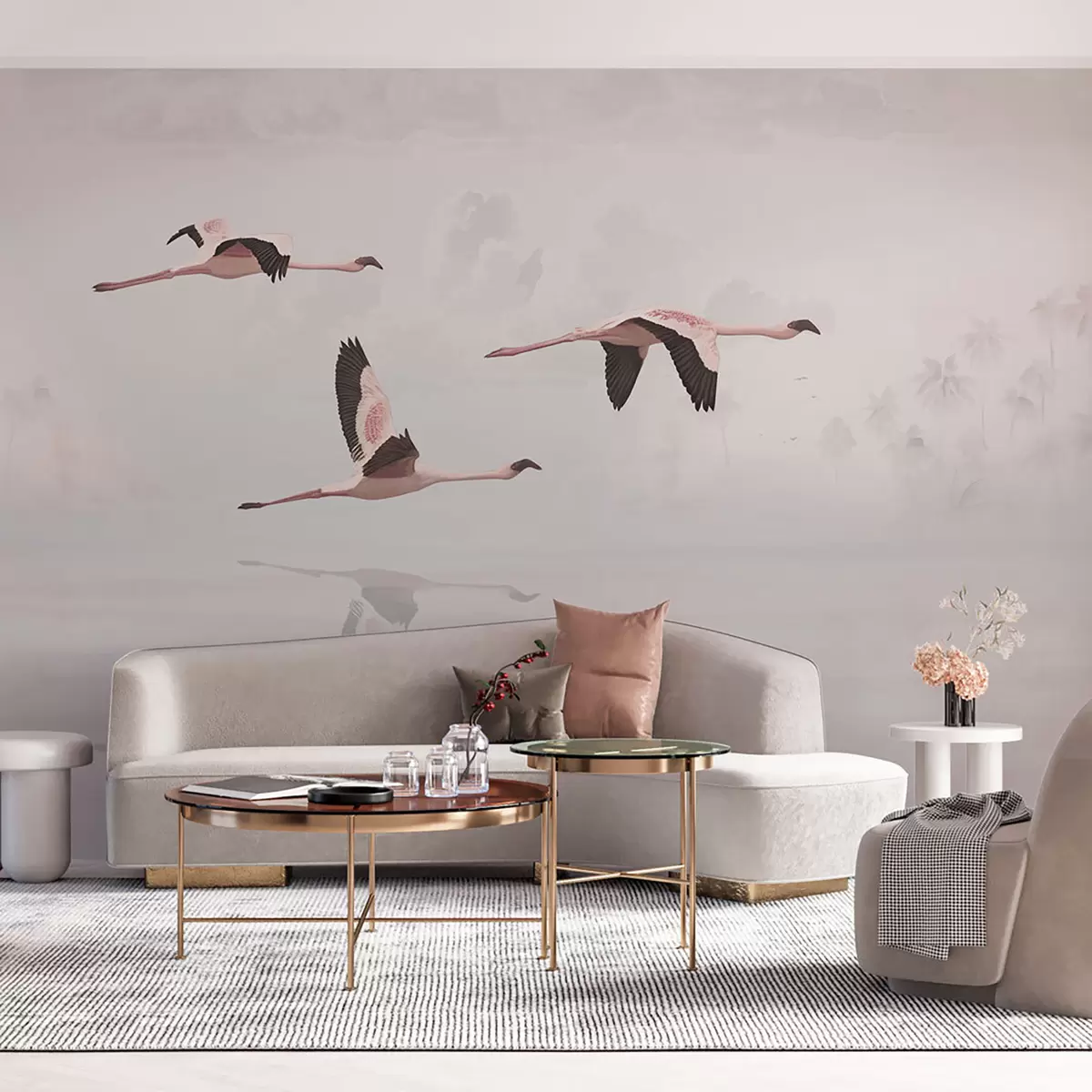 Fotomurales Flamencos rosados sobre la playa y el mar de la selva tropical Nr. u97457