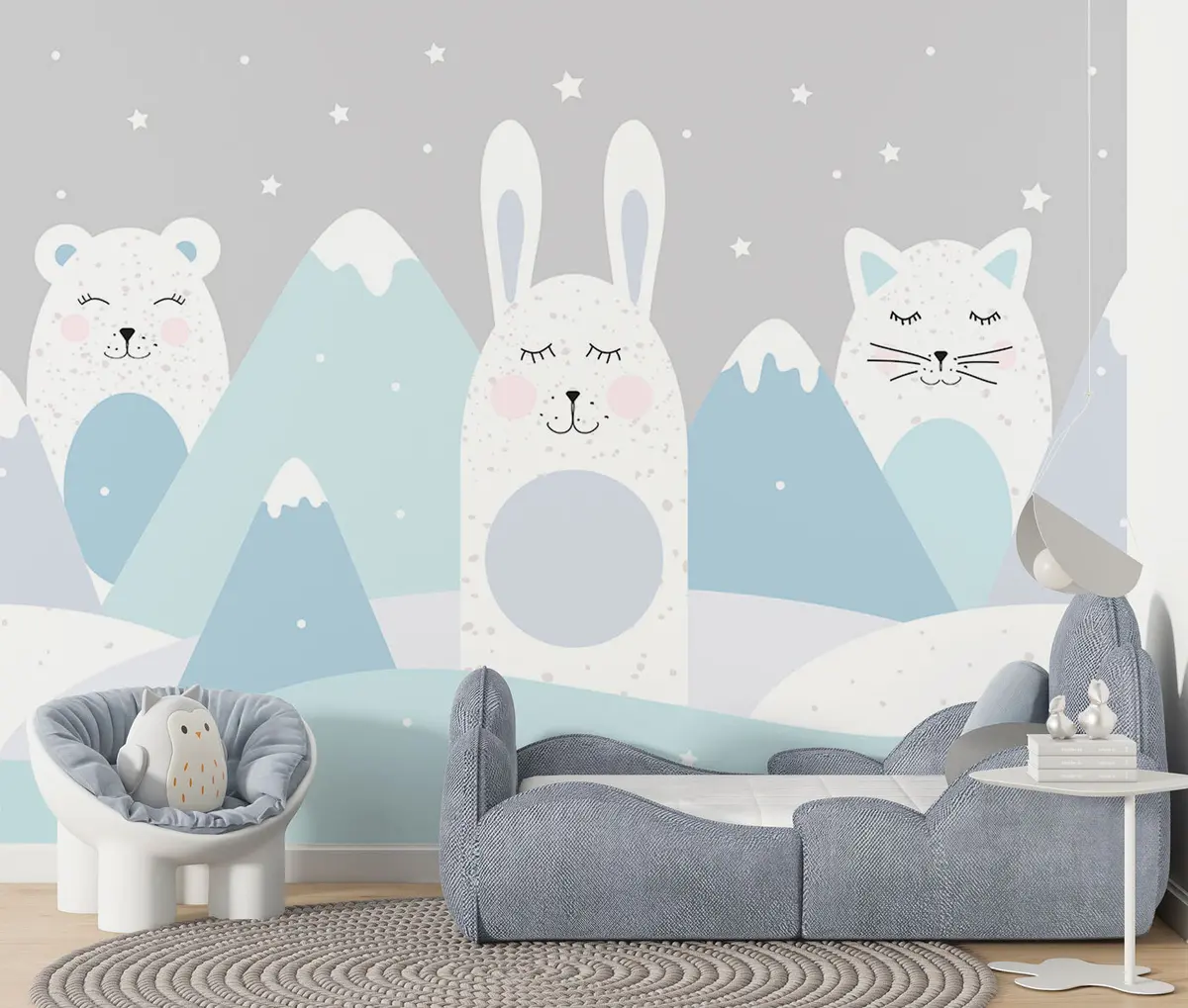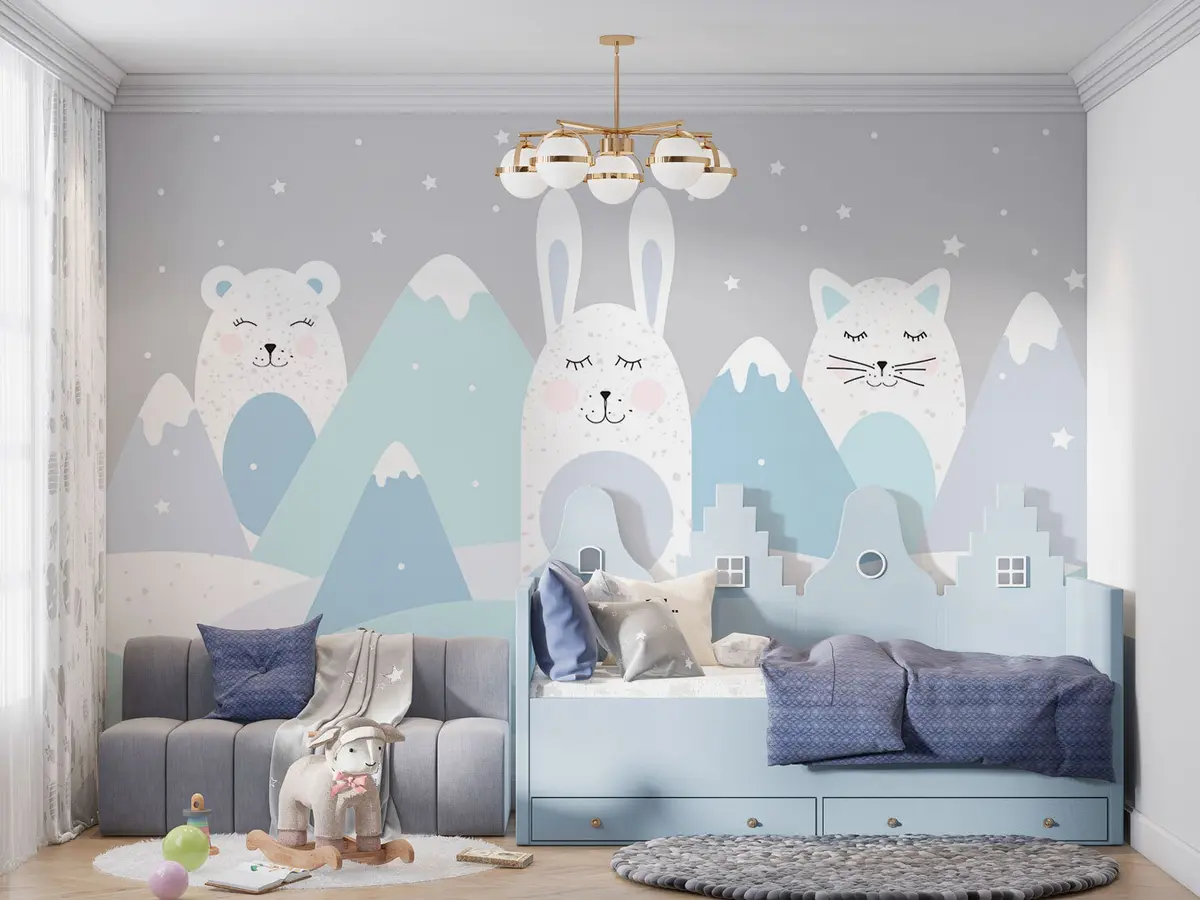 Fotomurales Conejo, oso, zorro sobre un fondo de montañas nevadas de color beige Nr. u98135v1