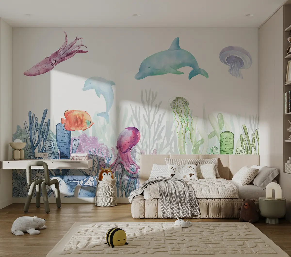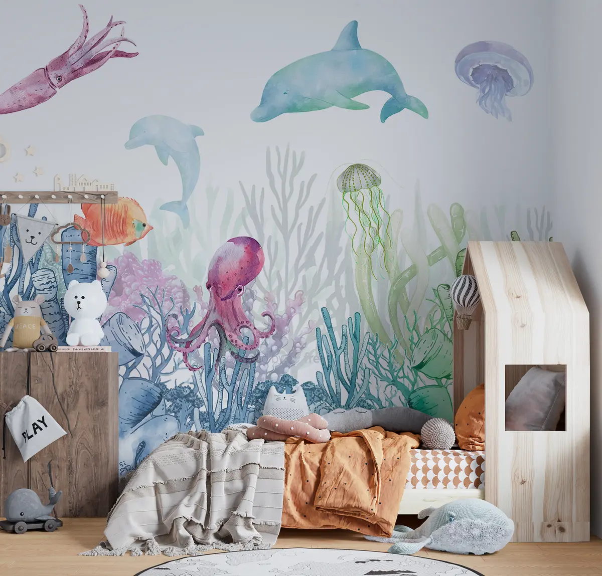 Fotomurales Vida marina submarina, Animales marinos, Acuarela, Corales, Delfín, Pulpo Nr. u98899