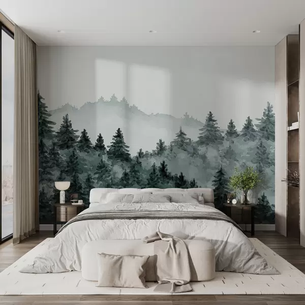 Fotomurales Acuarela paisaje forestal, niebla, color verde, pinos Nr. u98994