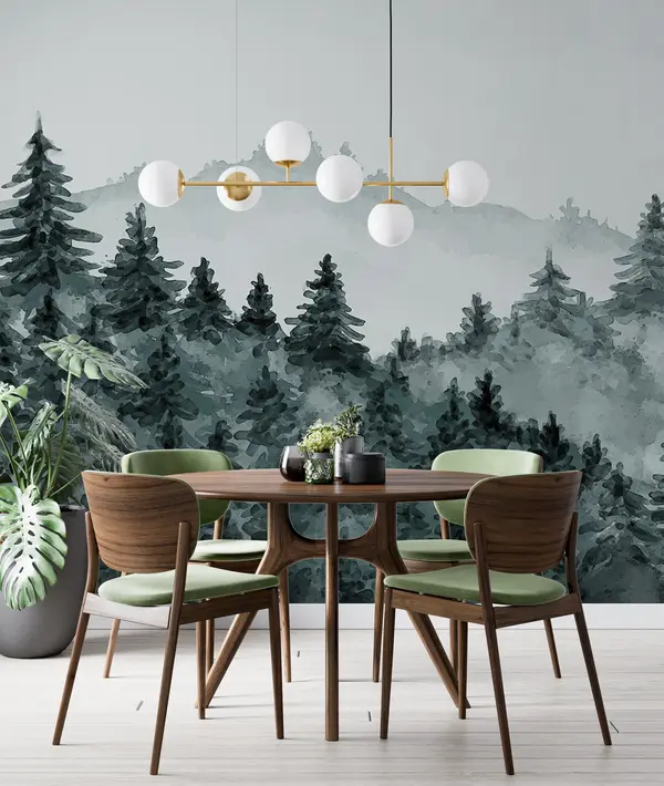 Fotomurales Acuarela paisaje forestal, niebla, color verde, pinos Nr. u98994
