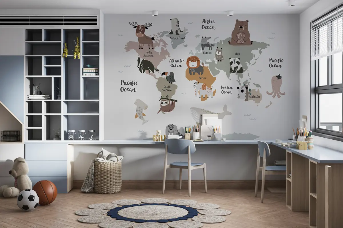 Fotomurales Mapa del mundo para niños con simpáticos animales Nr. u99161