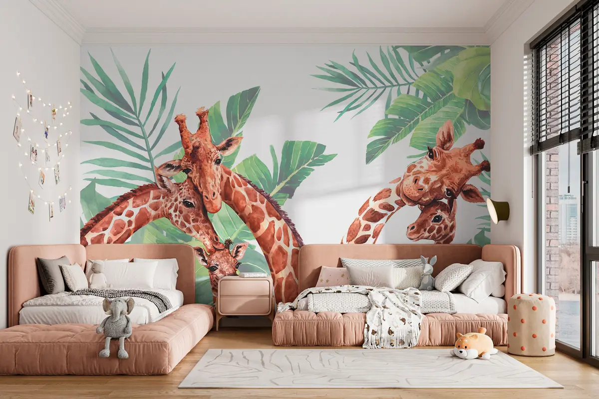 Fotomurales Familia de jirafas de dibujos animados y hojas de palmera sobre fondo blanco Nr. w00140v3