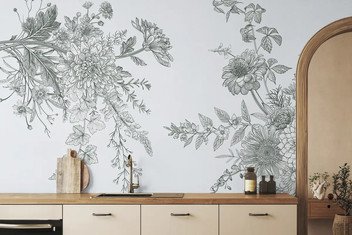 Fotomurales Adorno floral, minimalismo, arte lineal, estilo boho, rústico, peonía, margarita, colores azules, prado Nr. w00381v3