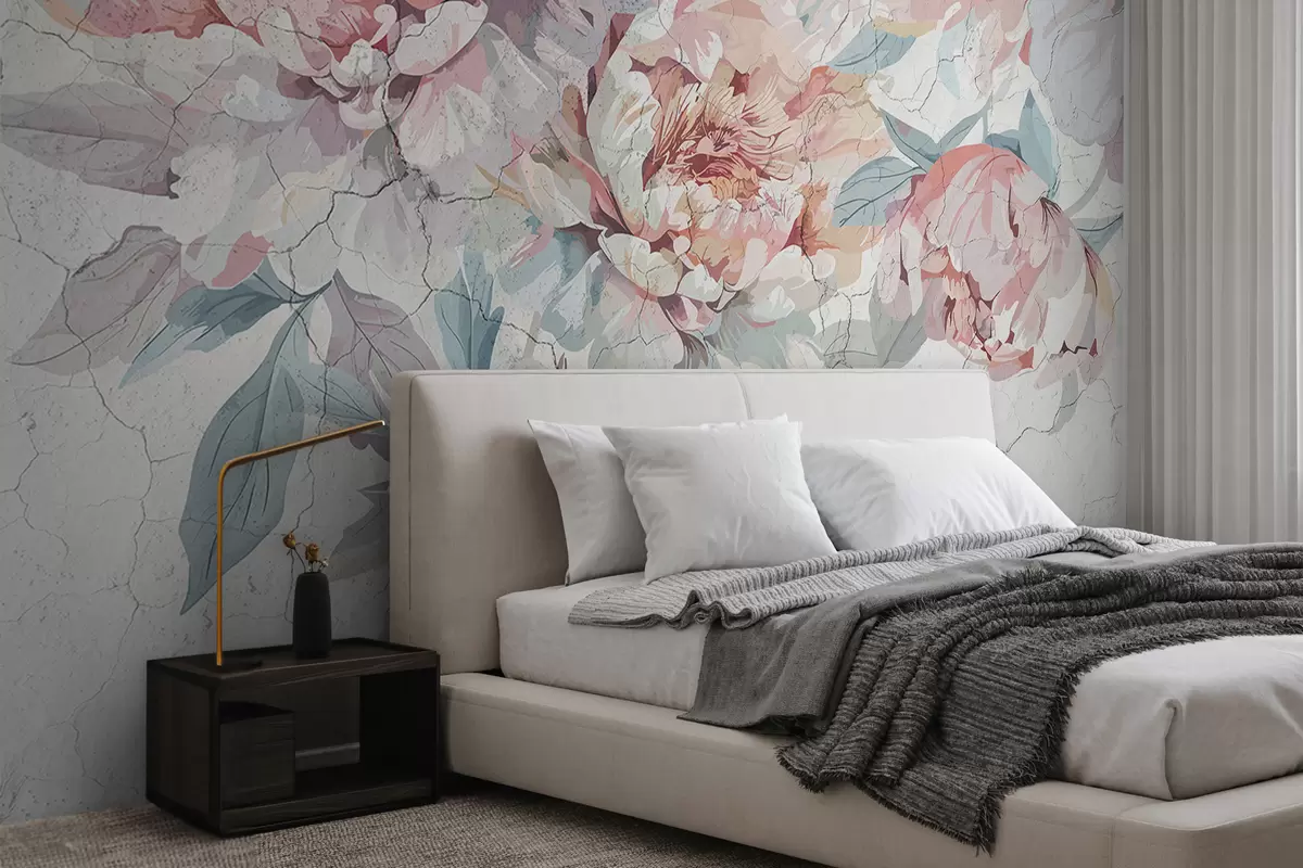 Fotomurales Un ramo de flores de peonía grandes, suaves, de color rosa pastel y blanco, con hojas verdes sobre un fondo claro Nr. w00896