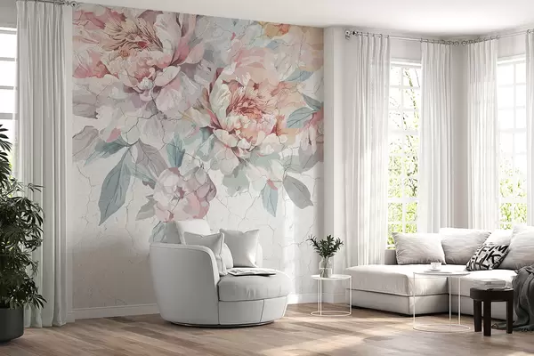 Fotomurales Un ramo de flores de peonía grandes, suaves, de color rosa pastel y blanco, con hojas verdes sobre un fondo claro Nr. w00896
