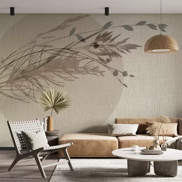 Fotomurales Una ilustración minimalista de una forma circular con elementos abstractos parecidos a plantas en tonos tierra apagados. Nr. w00902