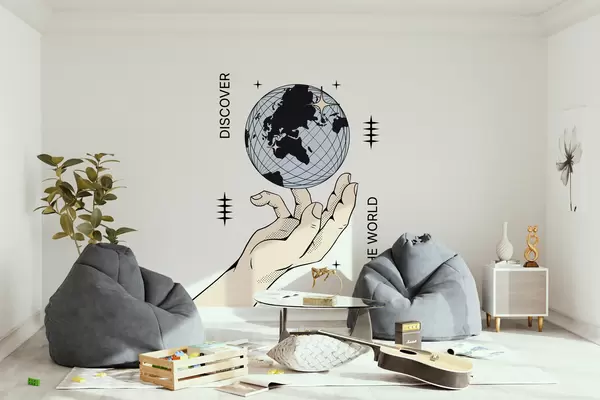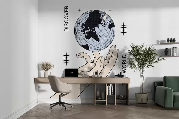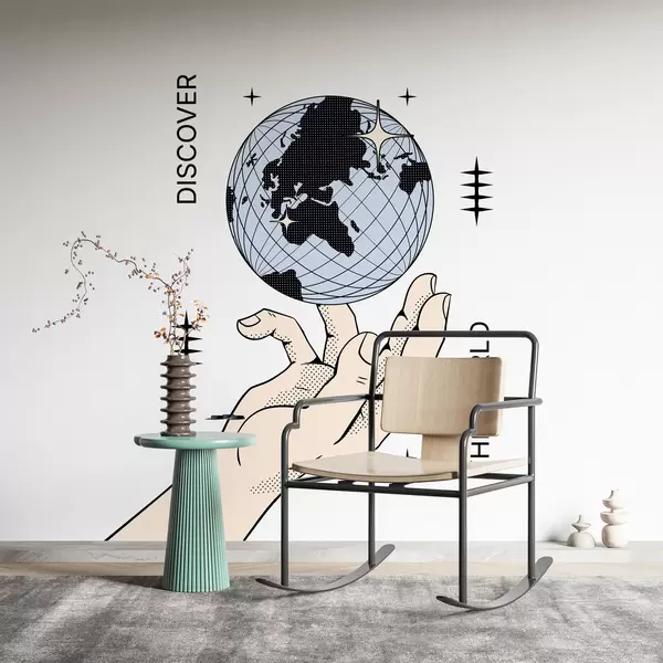 Fotomurales Mano beige girando el globo sobre un fondo blanco para la decoración de la habitación o la oficina Nr. w00984