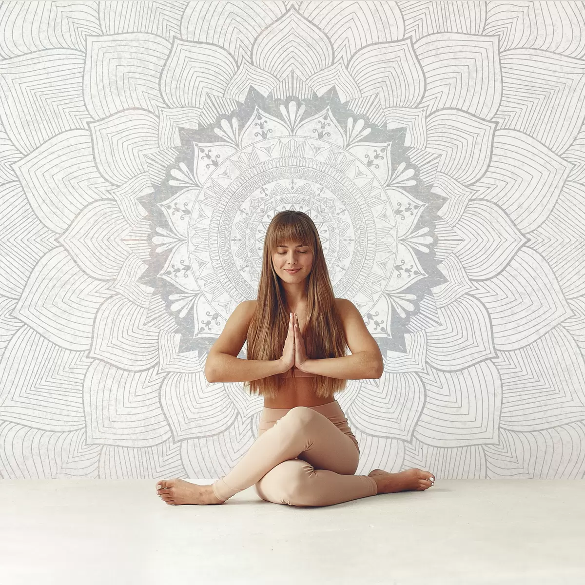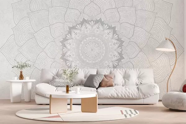 Fotomurales Mandala redondo, papel pintado para espacio de yoga o para armonizar el espacio personal. Mandala mural en tonos grises sobre fondo heterogéneo texturado Nr. w01088v2