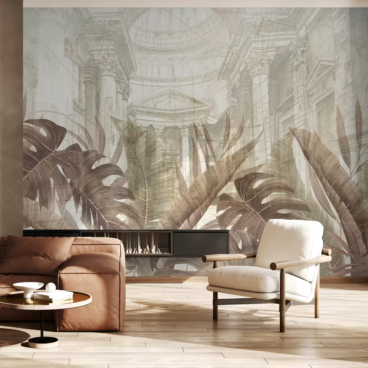 Fotomurales Un gran dibujo arquitectónico adornado con columnas de mármol y exuberantes plantas tropicales de color sepia. Nr. w01311v1