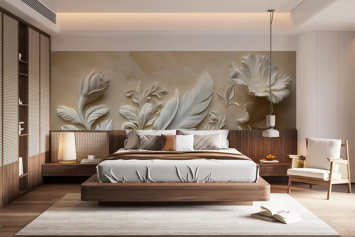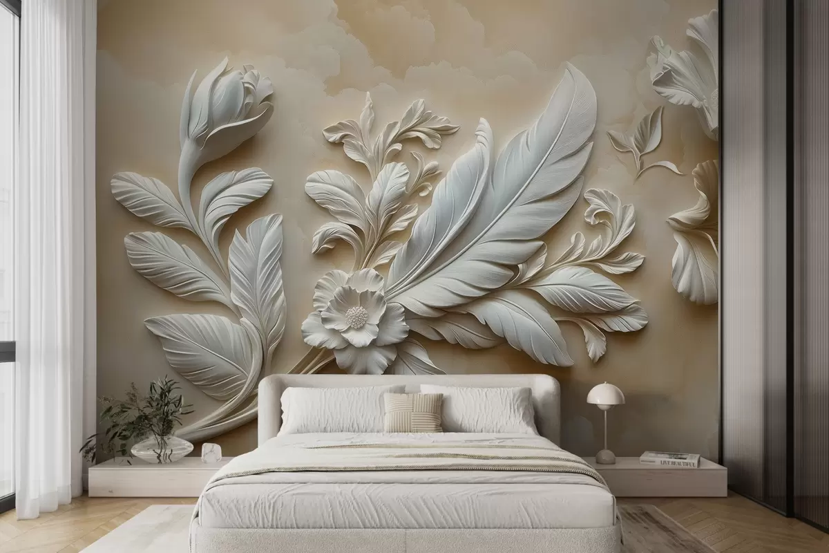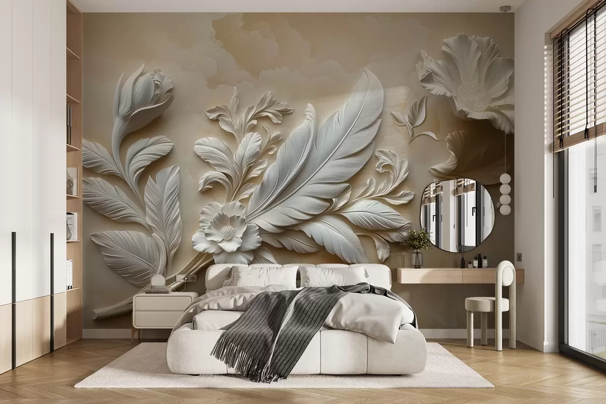 Fotomurales Graciosas flores en relieve con hojas y plumas en tonos beige Nr. w01355