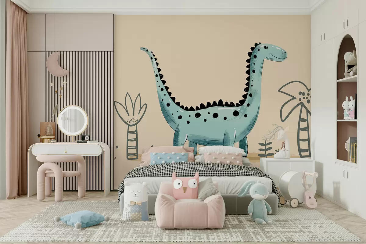 Fotomurales Lindo dinosaurio sobre un fondo beige con palmeras. Nr. w01357v1
