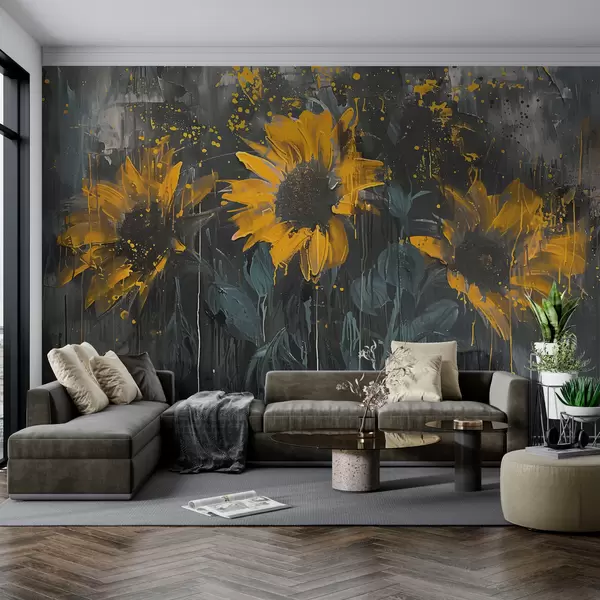 Fotomurales Cuadro abstracto de girasoles, fondo gris oscuro y tonos amarillos Nr. w01480
