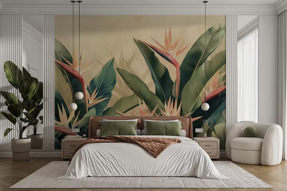 Fotomurales Arreglo exuberante de flores tropicales rodeadas de grandes hojas de color verde oscuro. Nr. w01484v1