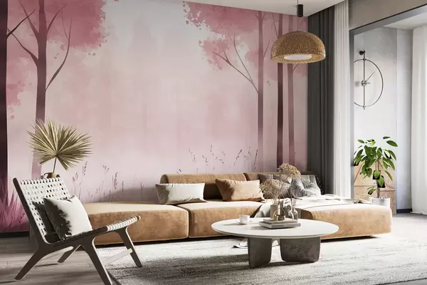 Fotomurales Acuarela bosque, niebla, árboles, hierba, paisaje natural, color rosa Nr. w01563v1