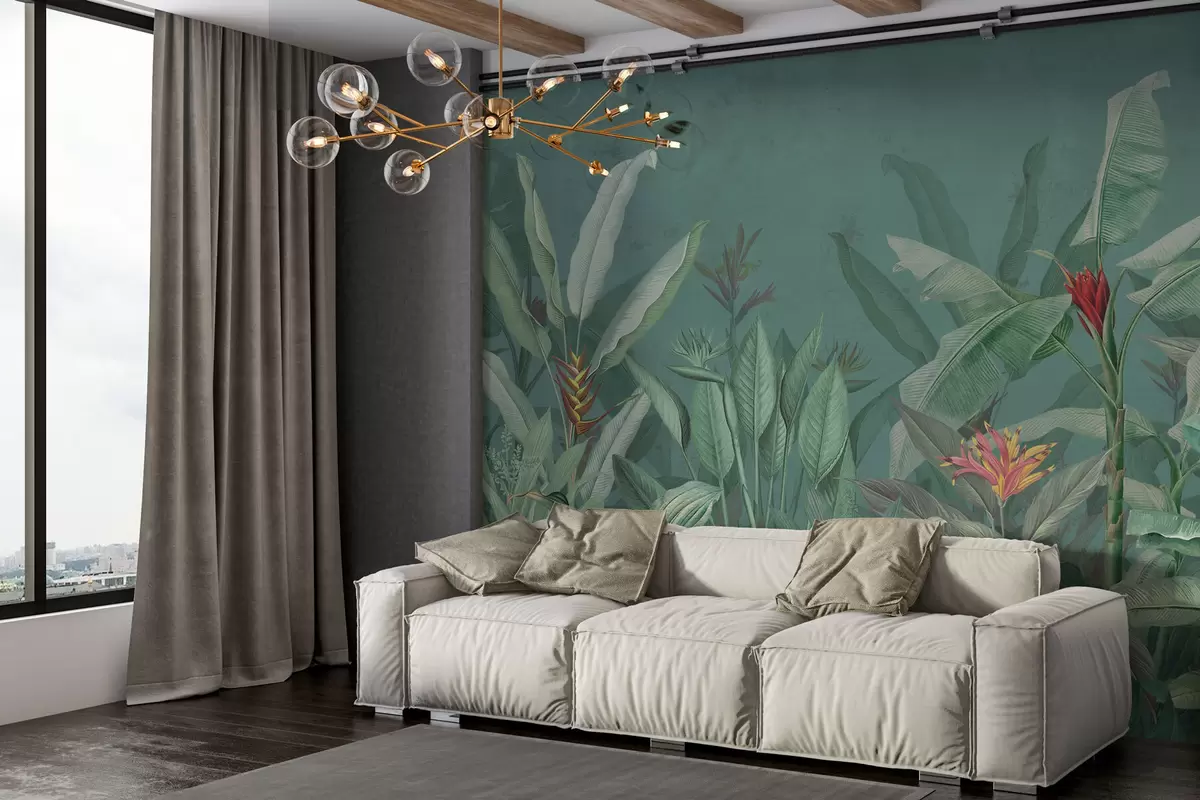 Fotomurales Hojas y flores tropicales sobre fondo verde Nr. w01834v2
