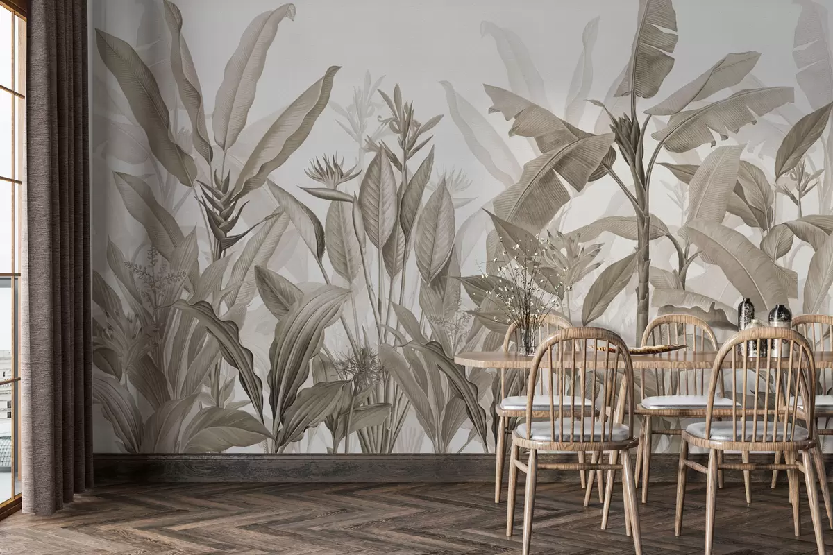 Fotomurales Hojas y flores tropicales sobre fondo claro en estilo sepia Nr. w01834v4