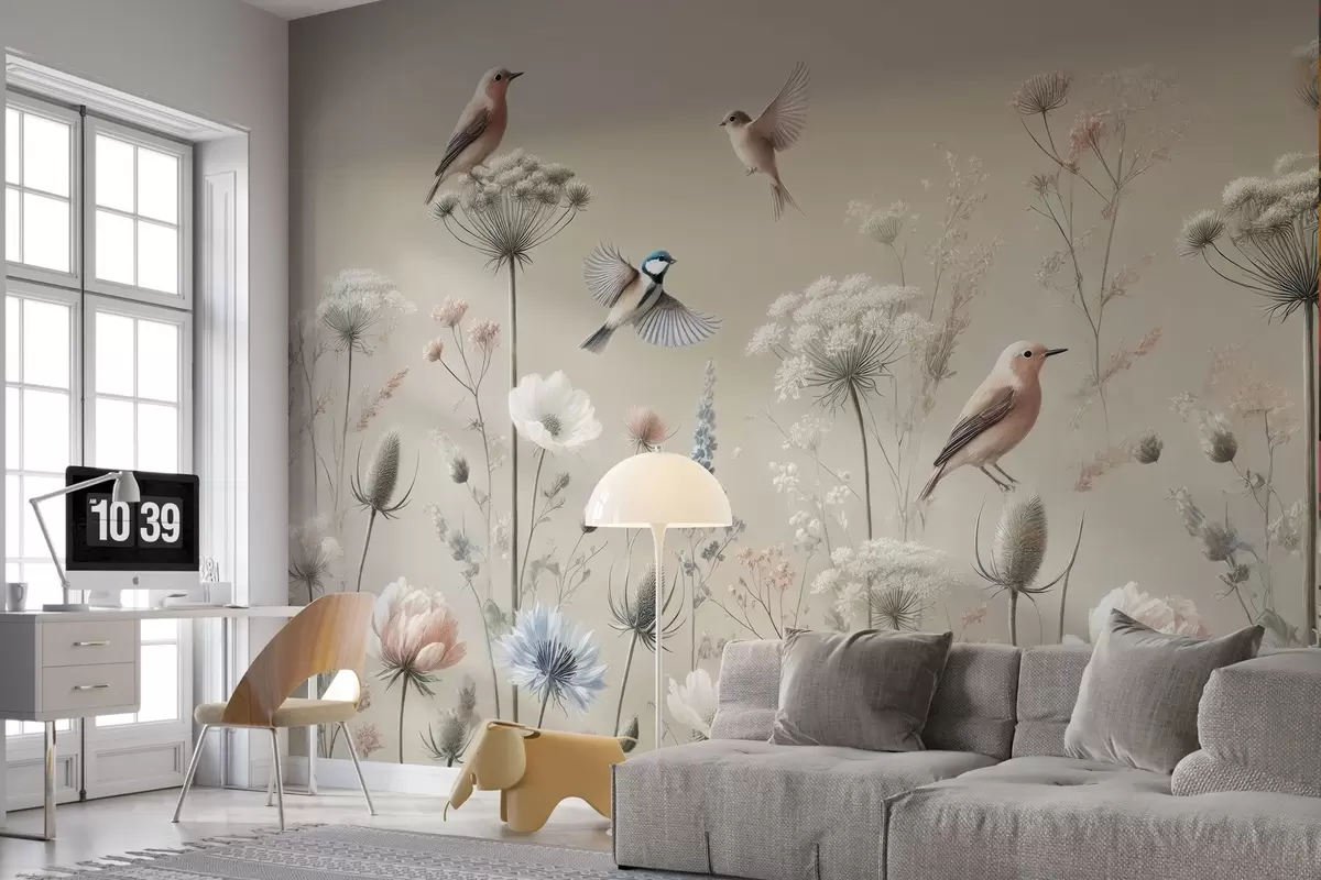 Fotomurales Delicadas flores silvestres con pájaros sobre fondo beige Nr. w01958