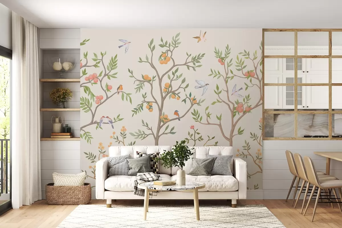 Fotomurales Diseño Chinoiserie con pájaros, árboles sinuosos, frutas y flores Nr. w02128