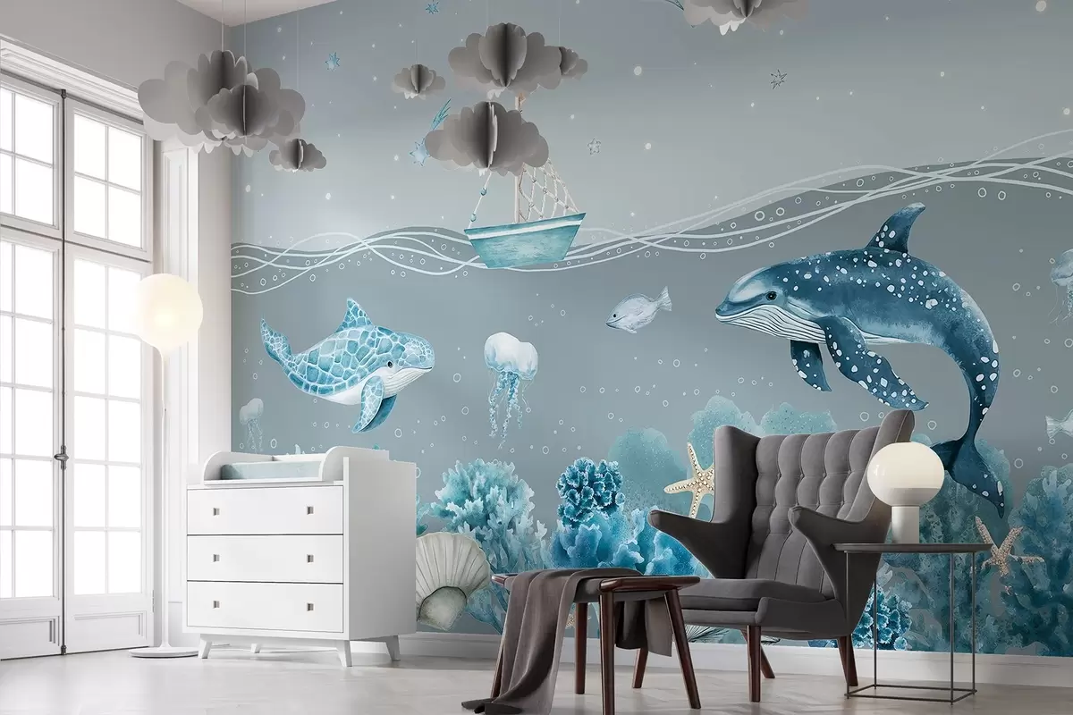 Fotomurales Vida marina, estilo acuarela, corales, barco, delfín, medusa, cielo estrellado, colores azules suaves Nr. w02310v3