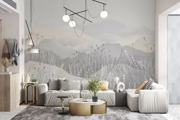 Fotomurales Montañas brumosas y hierbas y flores silvestres Nr. w02317